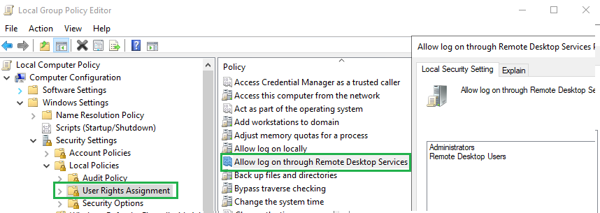 We will also need to allow log on throught Remote Desktop, from our local Policies