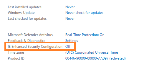 A default option we have to disable on our server is the IE Enhacement Protection, so we can download content from the internet from our server.