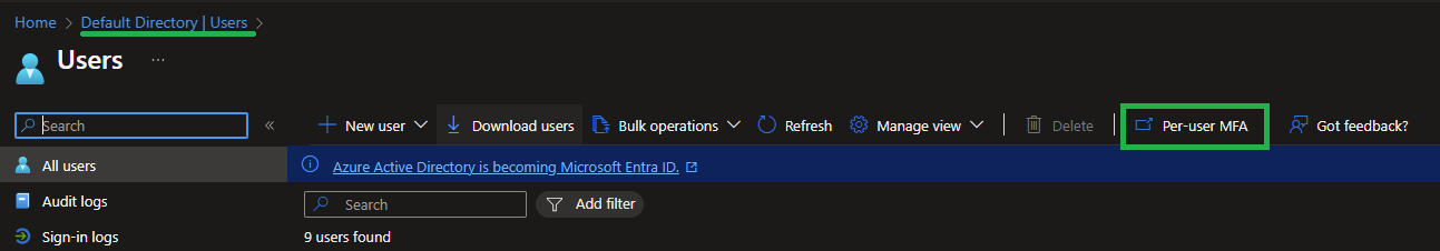 [AZURE] ▶ Users ▶ Per user MFA(top panel)