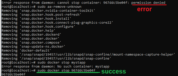 Error: Response from daemon:cannot stop caontainer: hash_id_num: permission denied.
